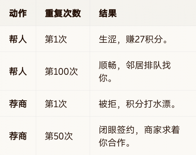粗糙:拿100积分去楼下超市,说“满100返10积分”。哪怕结巴,哪怕被赶。这就是粗糙的开始。