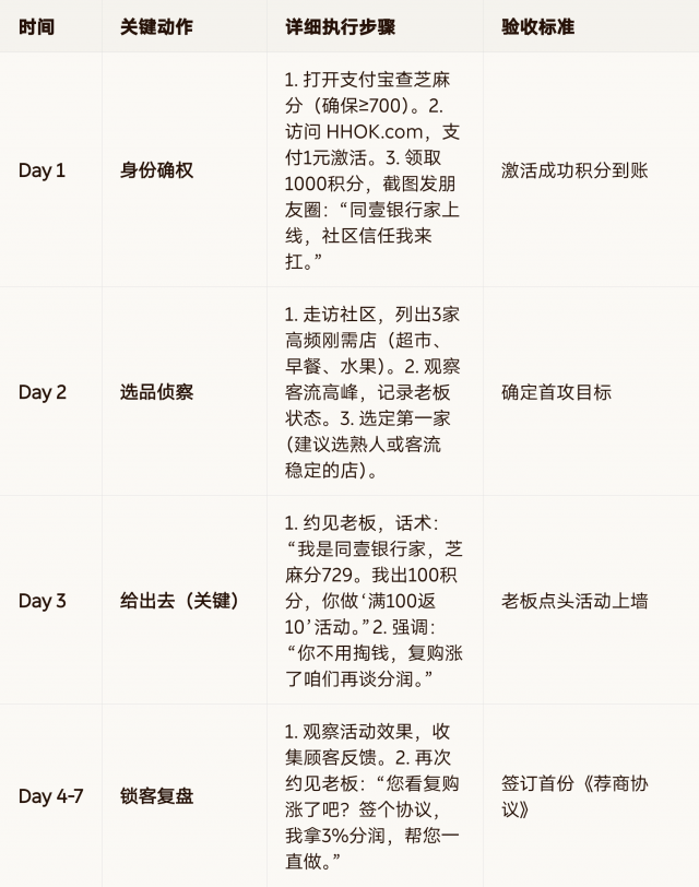 Day 3|给出去(关键)|1. 约见老板,话术:“我是同壹银行家,芝麻分729。我出100积分,你做‘满100返10’活动。”