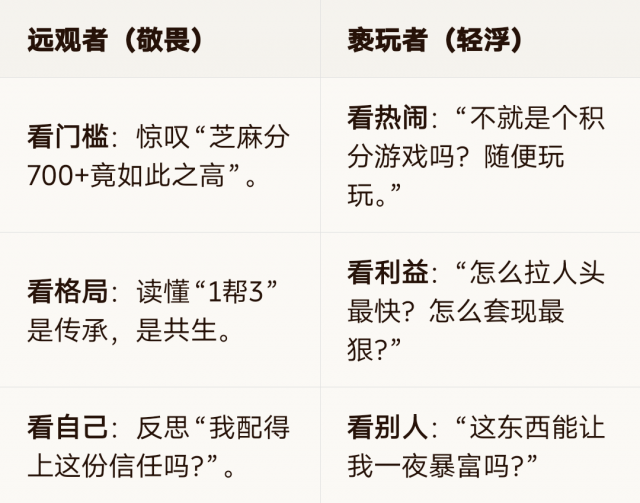 看门槛:惊叹“芝麻分700+竟如此之高”。|看热闹:“不就是个积分游戏吗?随便玩玩。”