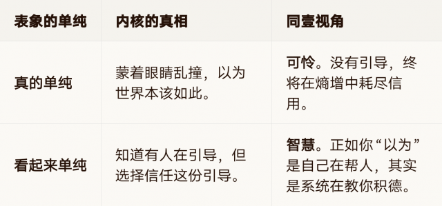 真的单纯|蒙着眼睛乱撞,以为世界本该如此。|可怜。没有引导,终将在熵增中耗尽信用。看起来单纯|知道有人在引导,但选择信任这份引导。|智慧。正如你“以为”是自己在帮人,其实是系统在教你积德。