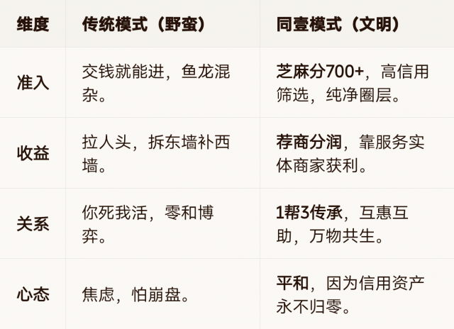 准入|交钱就能进,鱼龙混杂。|芝麻分700+,高信用筛选,纯净圈层。