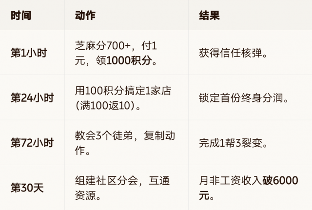 话术:“老板,我预授出100积分,您做‘满100返10’。我只拿3%流水,成了您赚,不成我亏。”