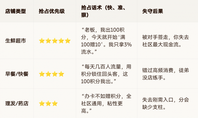 理发/药店|⭐⭐⭐|“办卡不如赠积分,全社区通用,粘性更高。”|失去刚需入口,分会缺少支柱。