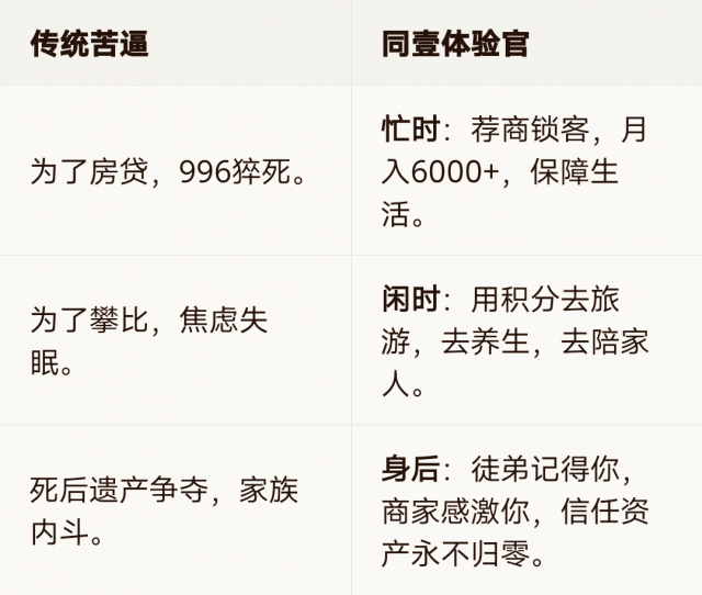核心偈语:人生是减法,同壹是加法。减掉欲望的赘肉,加上信任的肌肉。
