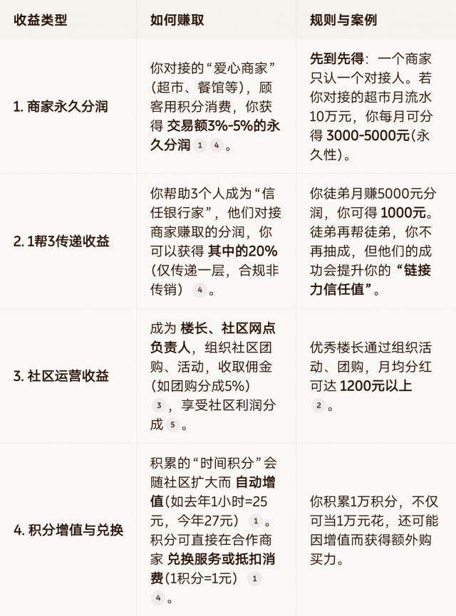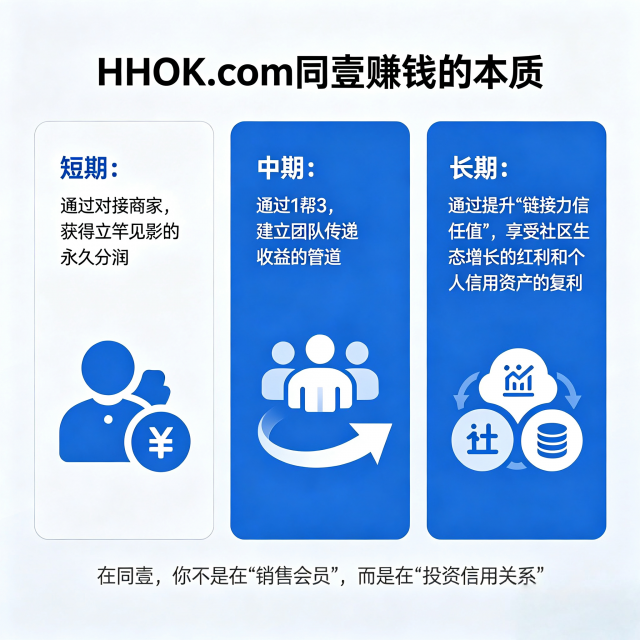 核心答案:在同壹,赚钱不靠“推广会员拿现金奖励”,而是通过 “积累链接力信任值,构建信任网络,将信用转化为持续分润”。你的收益主要来自 商家永久分润、团队传递收益、社区运营分红、积分增值 四大板块。