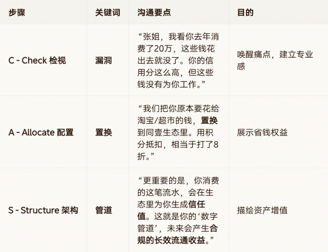 C - Check 检视|漏洞|“张姐,我看你去年消费了20万,这些钱花出去就没了。你的信用分这么高,但这些钱没有为你工作。”|唤醒痛点,建立专业感