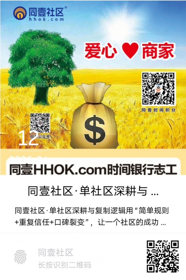 同壹的社区运营,不是“做大事”,而是“把‘帮人、荐商、带徒’的小事重复做,用‘芝麻分+预授信+满赠’的实惠建信任,用‘1帮3裂变’织网络”。当你做好一个社区,你会发现:信任资产的复利效应,比你想象的更快。