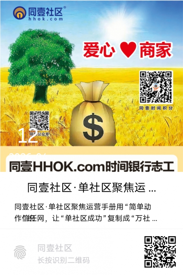 同壹是全球首家社区信任资产生态平台,通过「时间银行(服务=积分)+城优品(商家引流)+信任贷(低息融资)+1帮3裂变(网络扩张)」四大工具,将“善意”转化为可量化、可增值、可传承的信任资产(1小时服务=1小时积分=27元时间值购买力,年增值5%-8%)。