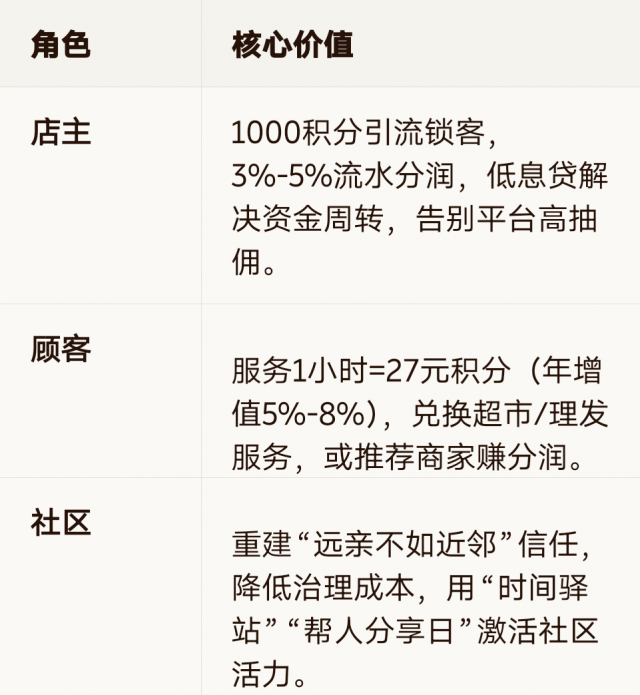 顾客|服务1小时=27元积分(年增值5%-8%),兑换超市/理发服务,或推荐商家赚分润。