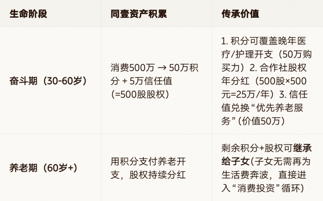奋斗期(30-60岁)|消费500万 → 50万积分 + 5万信任值(=500股股权)|1. 积分可覆盖晚年医疗/护理开支(50万购买力)2. 合作社股权年分红(500股×500元=25万/年)3. 信任值兑换“优先养老服务”(价值50万)