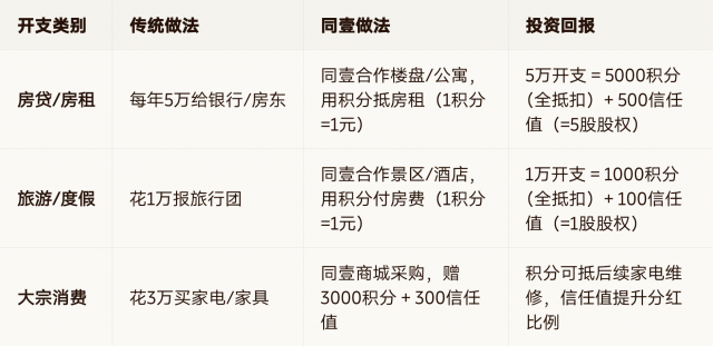 房贷/房租|每年5万给银行/房东|同壹合作楼盘/公寓,用积分抵房租(1积分=1元)|5万开支 = 5000积分(全抵扣)+ 500信任值(=5股股权)