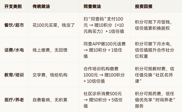 餐饮/超市|花100元买菜,钱没了|扫“同壹码”支付100元 → 赠10积分(=10元购买力)+ 1信任值|积分可抵下月饭钱,信任值累积换股权
