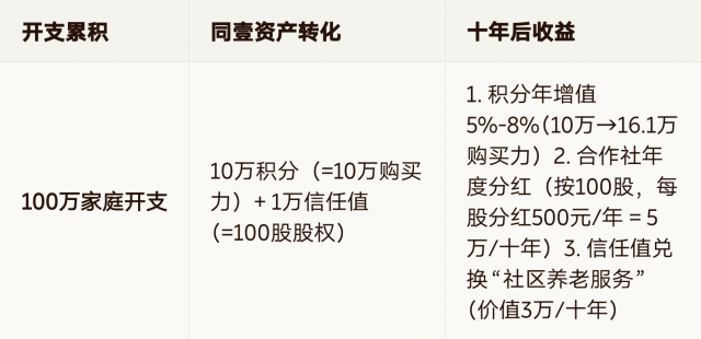 100万家庭开支|10万积分(=10万购买力)+ 1万信任值(=100股股权)|1. 积分年增值5%-8%(10万→16.1万购买力)2. 合作社年度分红(按100股,每股分红500元/年 = 5万/十年)3. 信任值兑换“社区养老服务”(价值3万/十年)