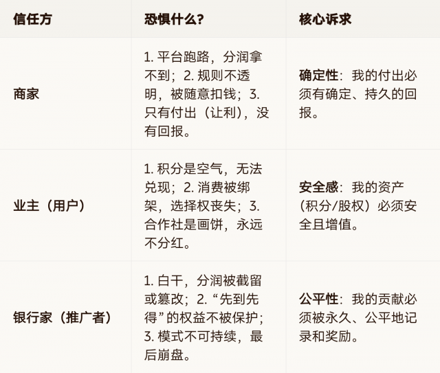 商家|1. 平台跑路,分润拿不到;2. 规则不透明,被随意扣钱;3. 只有付出(让利),没有回报。|确定性:我的付出必须有确定、持久的回报。