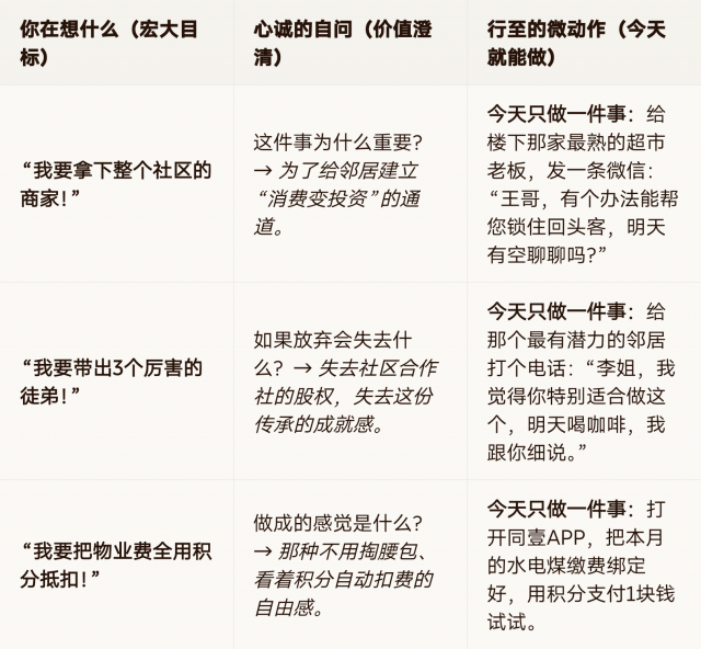 “我要带出3个厉害的徒弟!”|如果放弃会失去什么?→ 失去社区合作社的股权,失去这份传承的成就感。|今天只做一件事:给那个最有潜力的邻居打个电话:“李姐,我觉得你特别适合做这个,明天喝咖啡,我跟你细说。”
