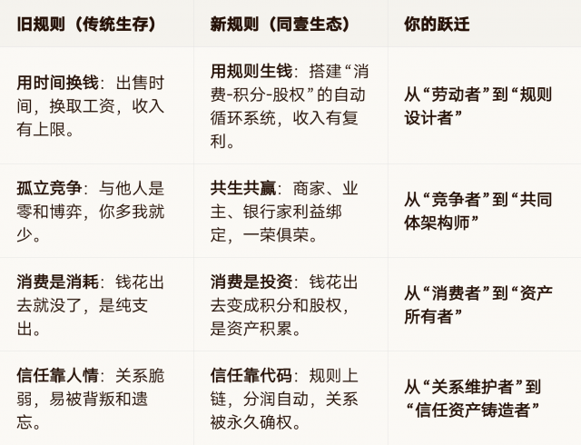用时间换钱:出售时间,换取工资,收入有上限。|用规则生钱:搭建“消费-积分-股权”的自动循环系统,收入有复利。|从“劳动者”到“规则设计者”