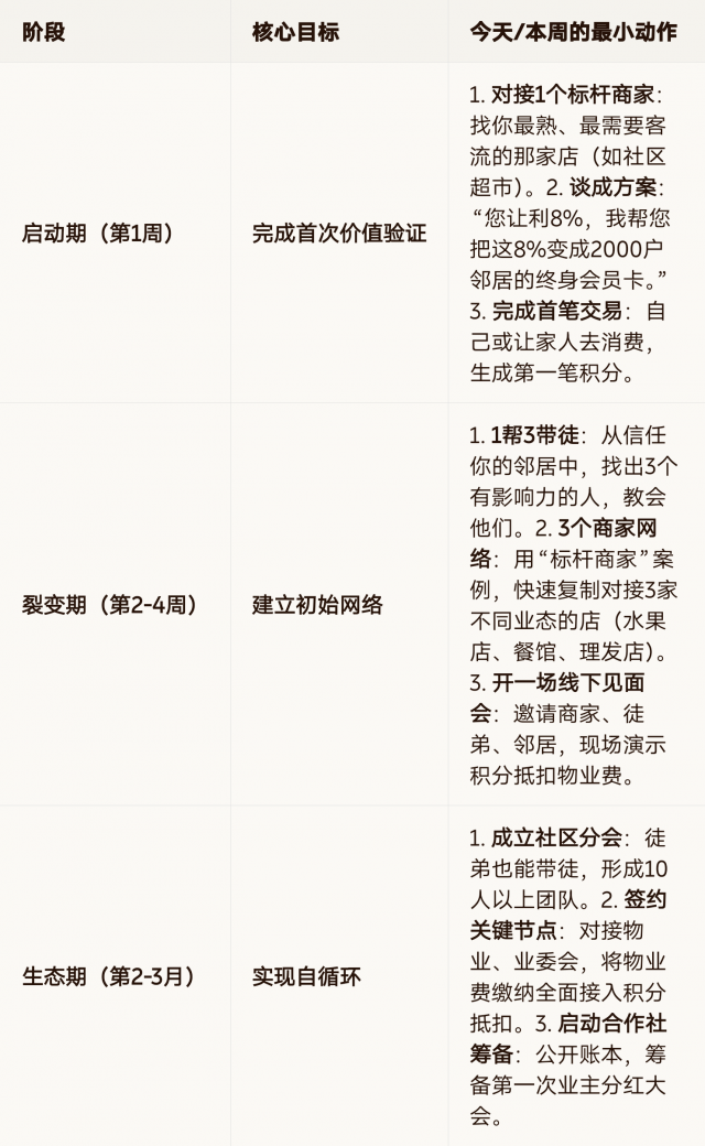 启动期(第1周)|完成首次价值验证|1. 对接1个标杆商家:找你最熟、最需要客流的那家店(如社区超市)。