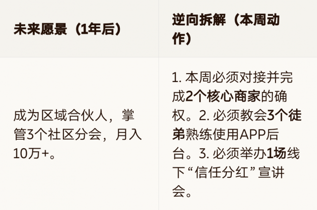 下切(How):将年度目标(如:建立100个社区分会)切割为季度里程碑,每日聚焦1项推进动作。