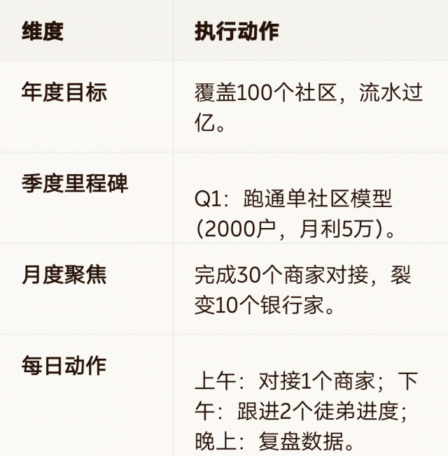 每日动作|上午:对接1个商家;下午:跟进2个徒弟进度;晚上:复盘数据。