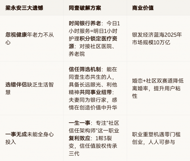 同壹是全球首个将社区信任资产化的生态平台,通过「时间银行+消费积分+合作社股权」三位一体模式,把居民日常消费转化为可增值、可传承的信任资产,破解梁永安教授提出的"健康忽视、伴侣错配、一事无成"三大人生遗憾。