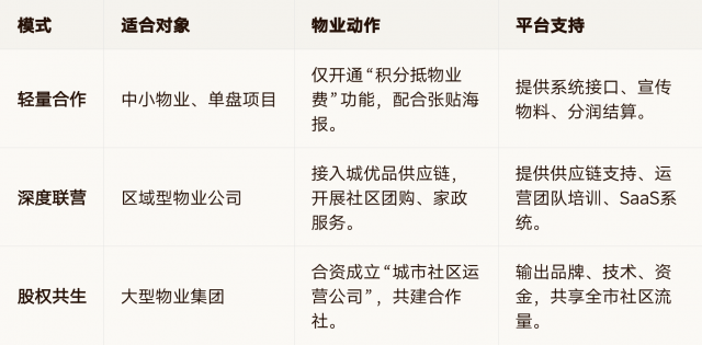 深度联营|区域型物业公司|接入城优品供应链,开展社区团购、家政服务。|提供供应链支持、运营团队培训、SaaS系统。
