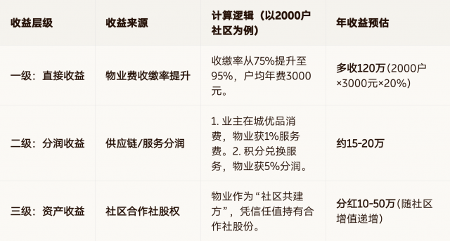 二级:分润收益|供应链/服务分润|1. 业主在城优品消费,物业获1%服务费。2. 积分兑换服务,物业获5%分润。|约15-20万