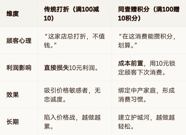 结论:打折是“割肉喂鹰”,赠积分是“播种收粮”。