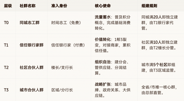 T2|社区合伙人群|楼长/支行长|组织自治:建分会、管供应链、分润结算。|城市满5个社区即组建,由T3区域监管。