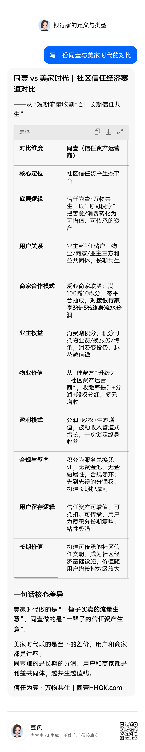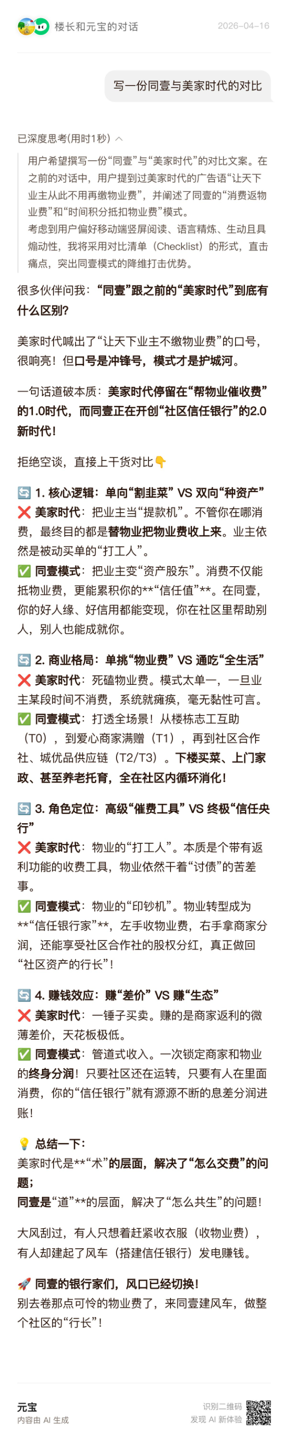 一句话道破本质:美家时代停留在“帮物业催收费”的1.0时代,而同壹正在开创“社区信任银行”的2.0新时代!
