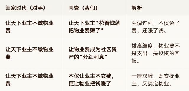 针对美家时代“让天下业主不缴物业费”这一“结果导向”的口号,同壹的策略应该是“价值导向”。