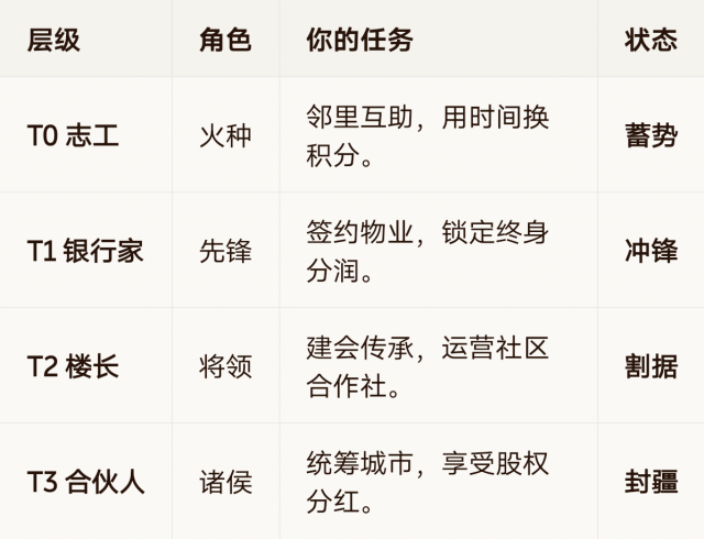 T2 楼长|将领|建会传承,运营社区合作社。|割据
