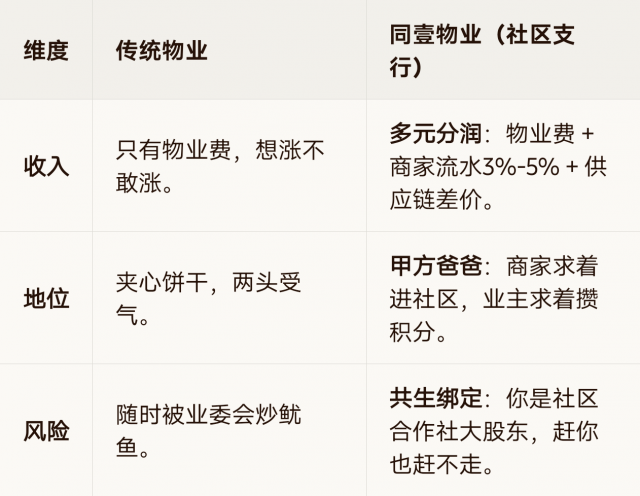 收入|只有物业费,想涨不敢涨。|多元分润:物业费 + 商家流水3%-5% + 供应链差价。