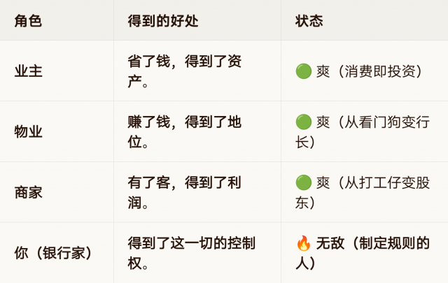分润是水流:业主消费 → 商家让利 → 积分流通 → 物业分润 → 银行家抽成。