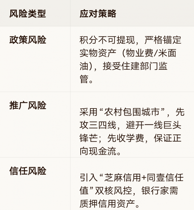 政策风险|积分不可提现,严格锚定实物资产(物业费/米面油),接受住建部门监管。