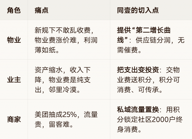 降维打击:传统物业靠收物业费(苦逼模式),同壹赋能物业转型“社区央行”(印钞模式)。