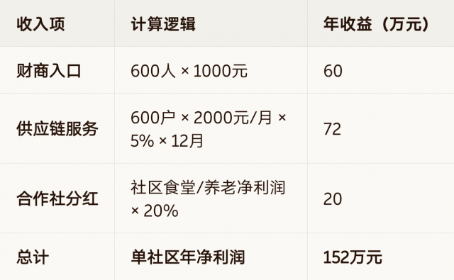 建会运营:成立社区合作社(食堂/养老),赚取运营管理费与股权分红。
