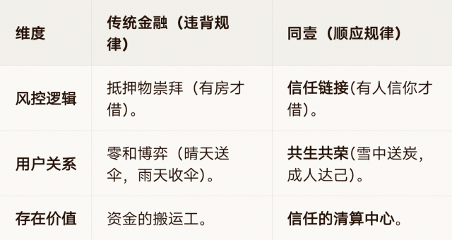 逻辑:传统银行借给有钱人(锦上添花),同壹借给“有信任值的人”(雪中送炭)。