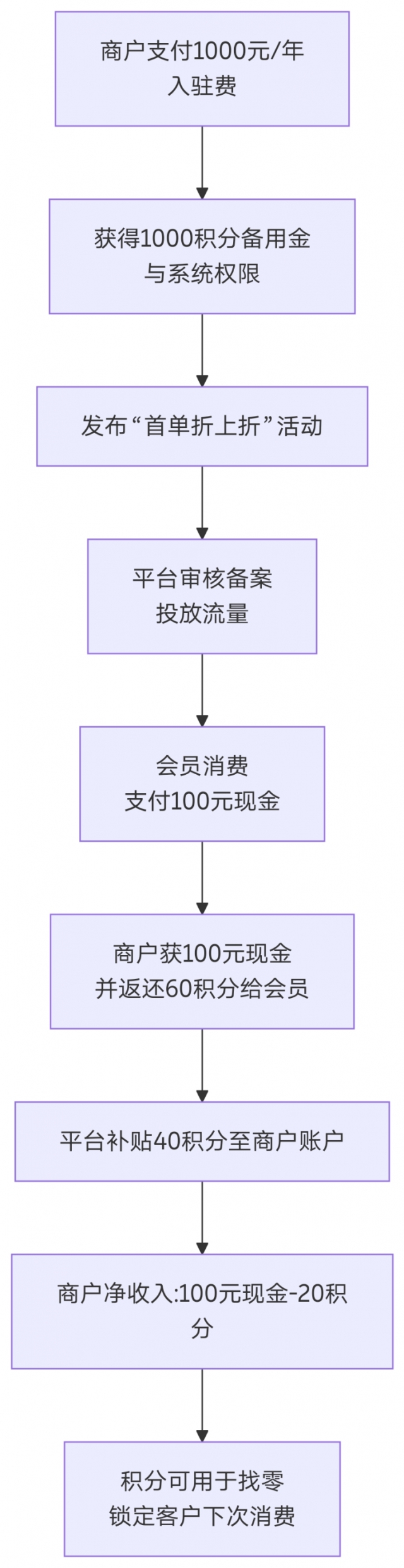 A[商户支付1000元/年<br>入驻费] --> B[获得1000积分备用金<br>与系统权限]