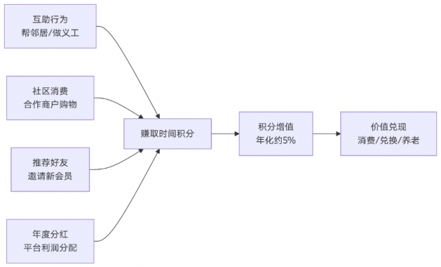 A[互助行为<br>帮邻居/做义工] --> E[赚取时间积分]